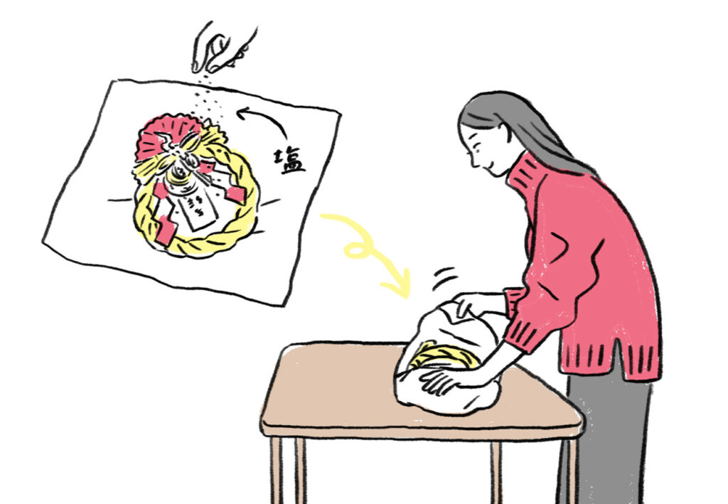 - 正月飾りに塩を軽く振るか、正月飾りの右・左・真ん中の順に一つまみの塩を置いて清めます。