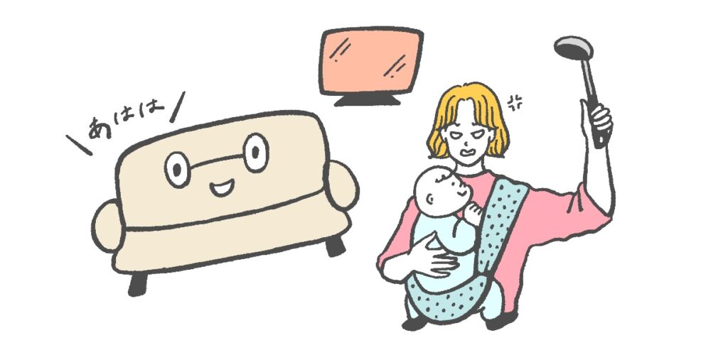 義実家に着いた瞬間、夫がソファと合体。テレビを見るか、スマホをいじるかで、まるで動く気ゼロ。「こっちは子ども見ながら、お義母さんの料理手伝ってるんだけど!?」と、内心ブチギレ案件でした(怒)。(ぱっちょむさん)