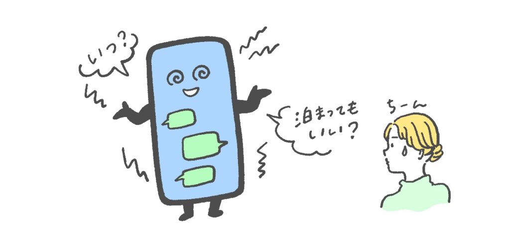 義父母とLINEを交換していないので、帰省の連絡は夫経由。でも…ぜんっぜん話がまとまらない! 「もう私が直接聞いた方が早い」と思いつつ、義父母とLINEを交換するのも気が重くて、結局いつもこのスタイルのままにしています。(まりもさん)
