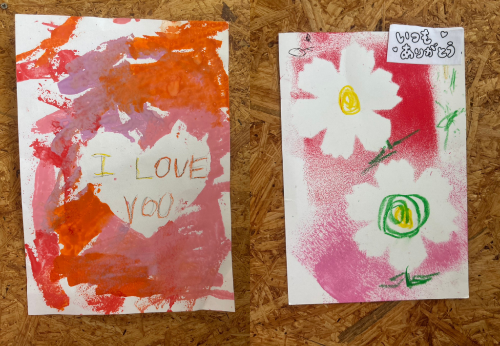 幼稚園の工作で作ってくれたメッセージカードをプレゼントしてくれた実例。ママのために一生懸命書いてくれた「I LOVE YOU」の文字やカーネーションの絵は、何物にも代えがたい宝物になったそう(ちあきさん)