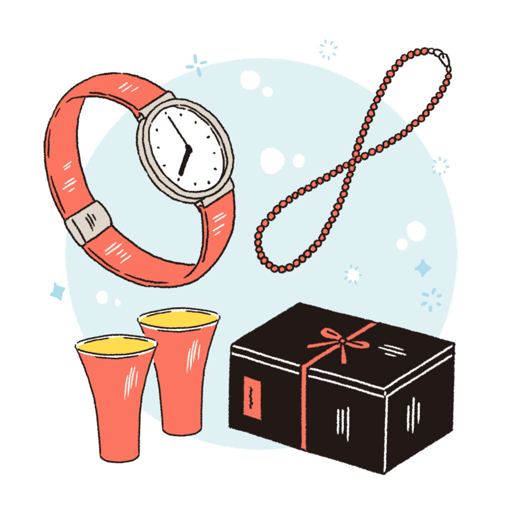 特別感のあるパーソナライズギフトも人気です。親の名前や感謝の言葉を刻印したお酒、タンブラー、お箸など。使うたびにお祝いの日の温かい記憶が蘇ります。