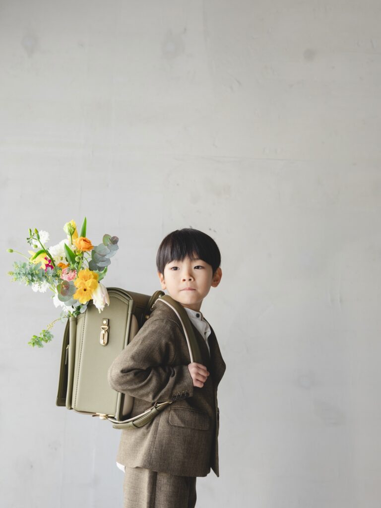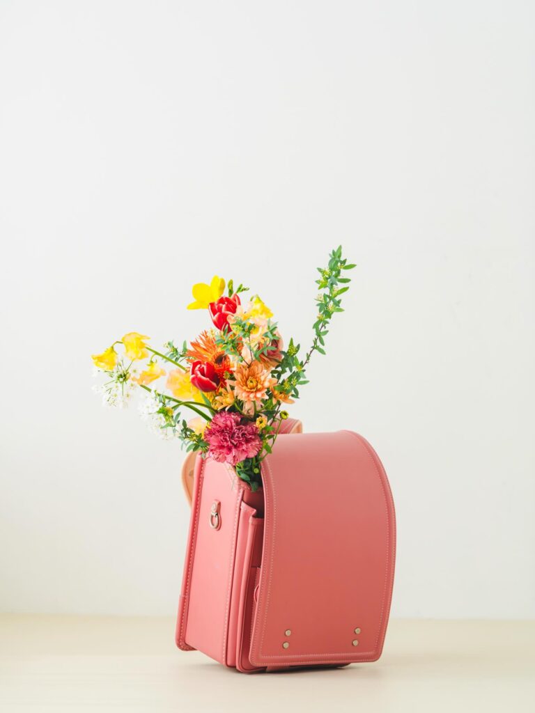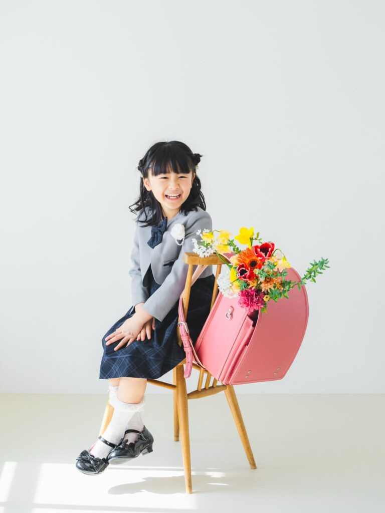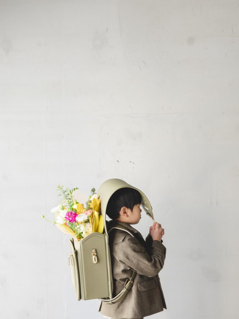 まっさらなランドセル。それだけで愛おしい姿を撮ることができますが、そこに色鮮やかな生花を添えることで、より素敵な1枚に。
