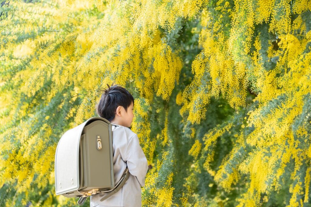 入学式の記念写真といえば、外せないのが桜や黄色いミモザなど、季節の花を背景にランドセル姿を残すスタイル。