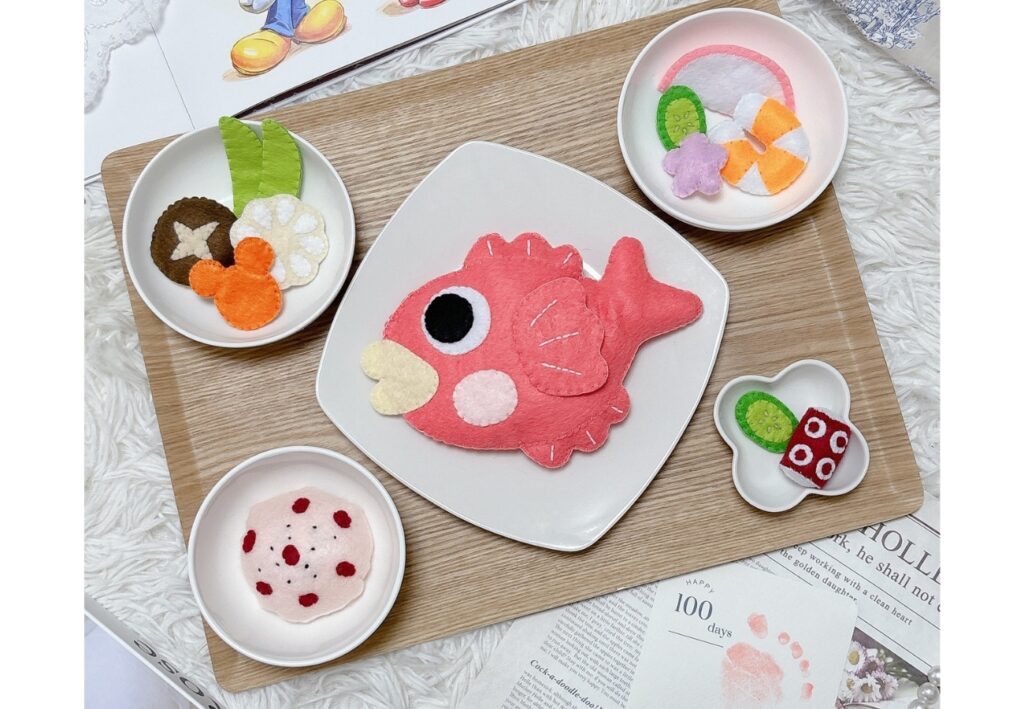 「形に残る思い出を作りたい」という想いから、フェルトで手作りのお食い初め膳を作ったアイデア。
