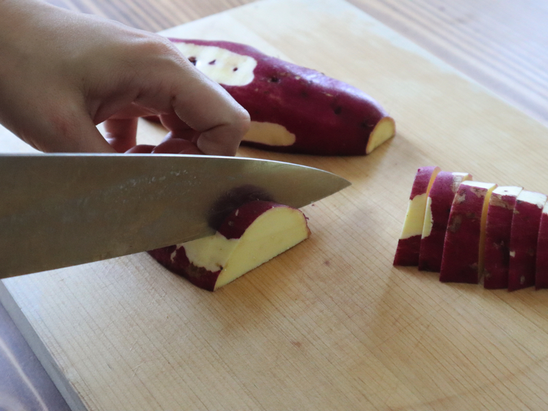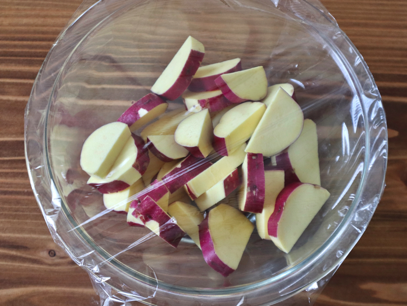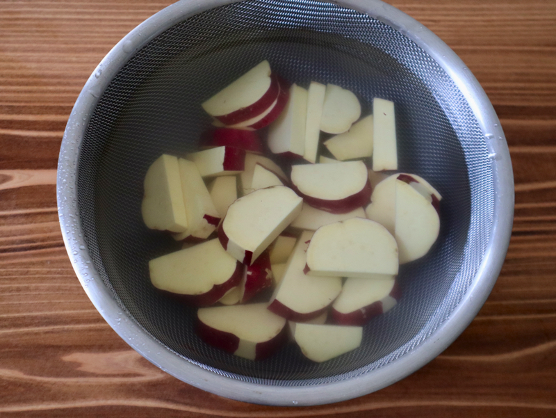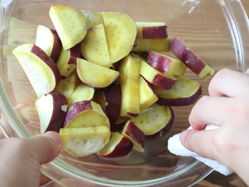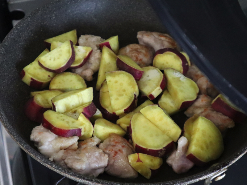 - さつまいもから出た水分をふき取り、フライパンに加える。蓋をして弱火で5分蒸し焼きにする。その間に【B】を合わせておく。