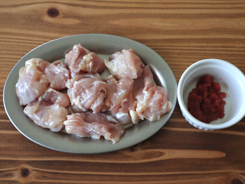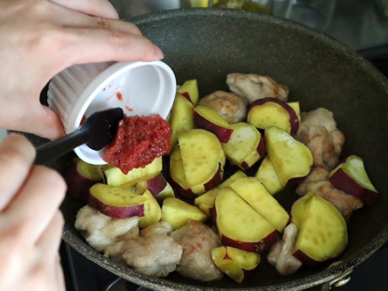- さつまいもは1㎝幅の半月切りにし、水にさらす。梅干しはタネを取り、ペースト状に叩く。鶏ももは角切りにする。