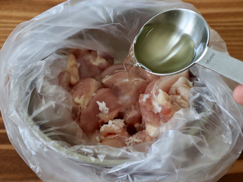 - 水気を切ったさつまいもを、レンジで600w4分加熱する。ポリ袋に鶏ももと【A】を入れ揉みこむ。片栗粉を加えて全体にまぶす。