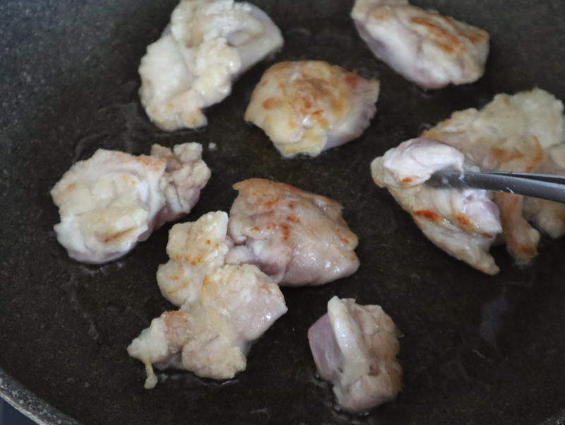 - 油を熱したフライパンに、鶏ももの皮目から焼く。中火で1分ほど焼いたら裏返す。