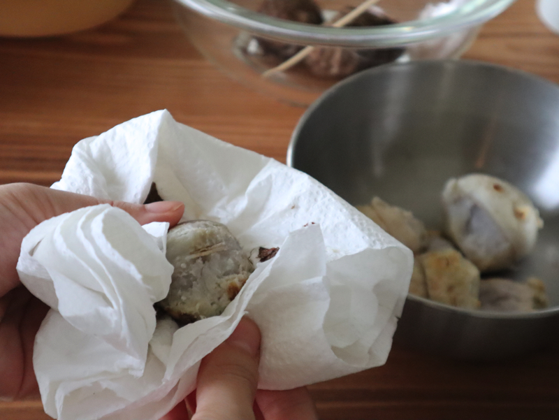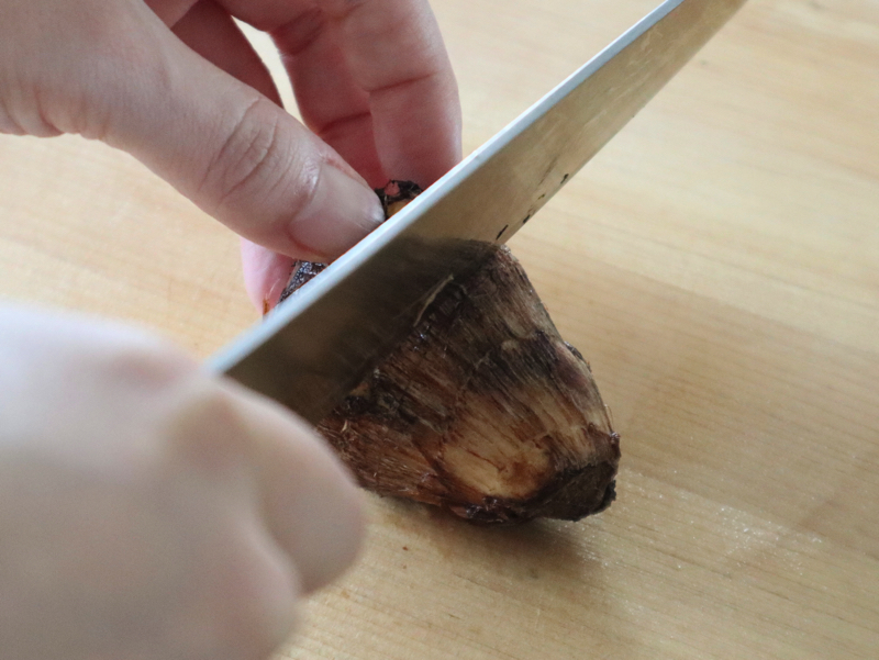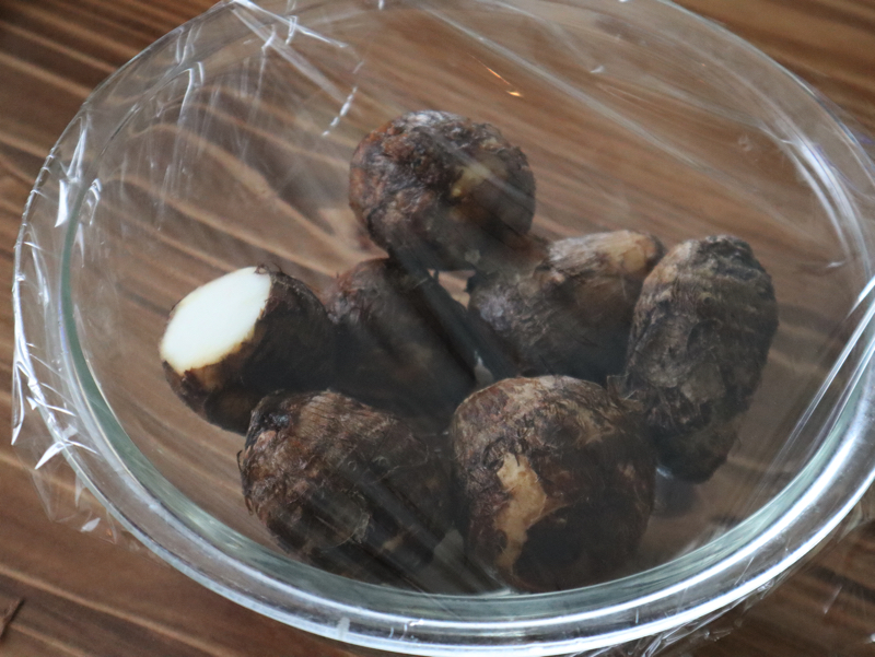 - 里芋をよく洗い、1周切り込みを入れる。里芋が大ければ2~3等分に切る。柔らかくなっているところは切り落とす。