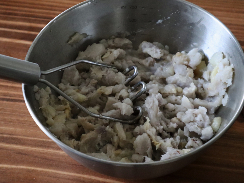 - やけどに注意しながら熱いうちに皮をむく。フォークやマッシャーなどで粗くつぶし、粗熱を取る。