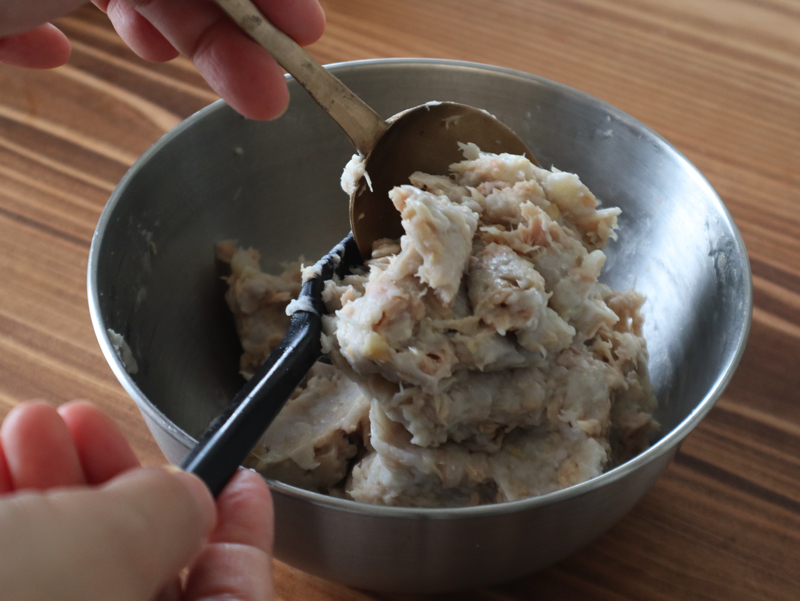- ボウルに軽く水気の切ったツナ缶と【A】を混ぜ合わせ、つぶした里芋に③を加えてよく和える。