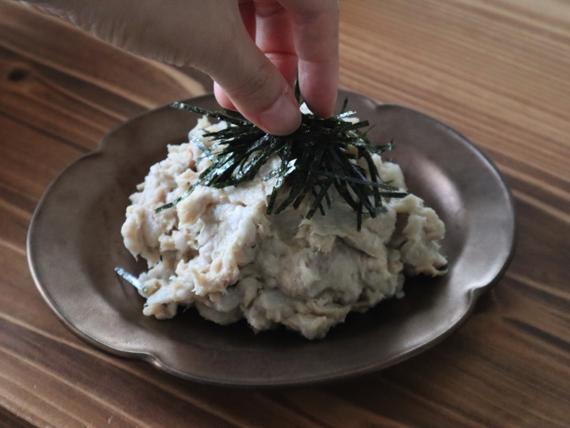 - 器に盛りつけ、仕上げに刻み海苔をのせる。