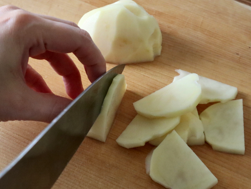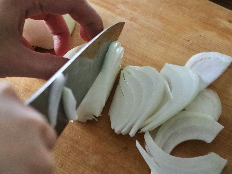- 玉ねぎは半分にし薄切り、じゃがいもは皮をむき半月の薄切りにする。