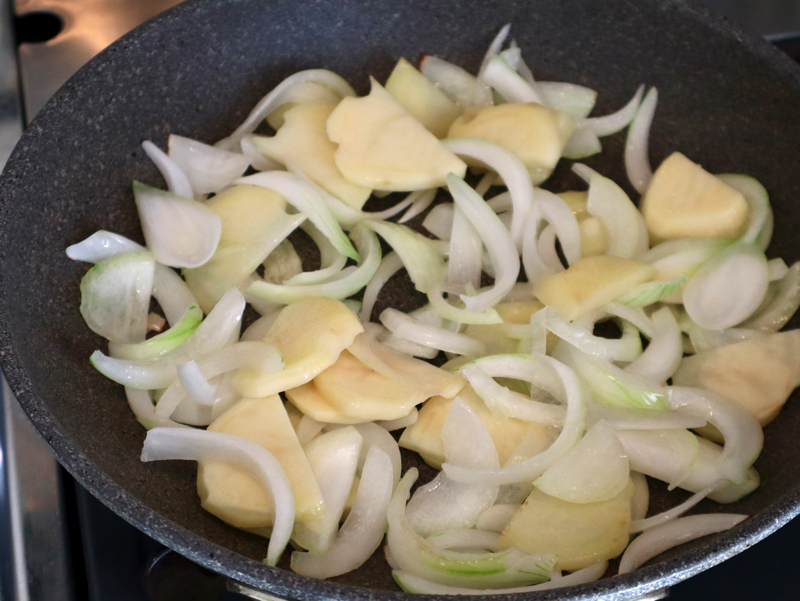 - フライパンに米油を入れて中火で熱し、玉ねぎとじゃがいもを透き通るまで炒める。