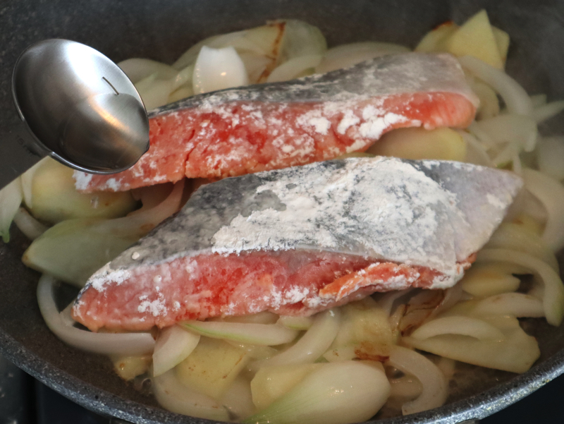 - 鮭を野菜の上に乗せて水を加え、ふたをして弱火で5分加熱する。