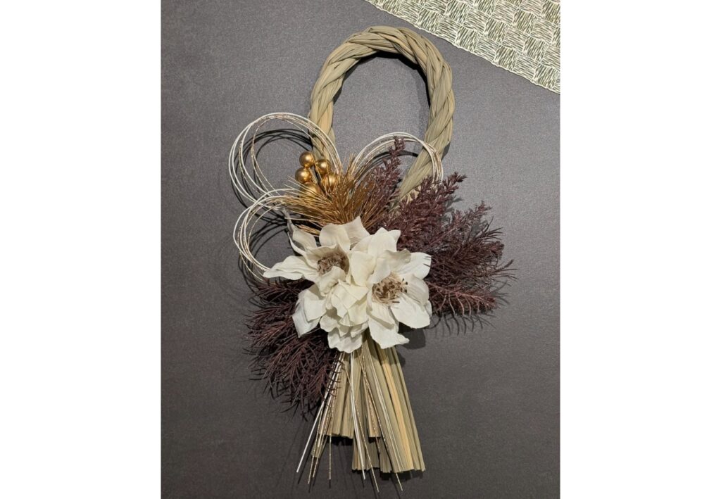 - ドライ風の花やゴールドの水引など、異なる質感の素材を組み合わせることで単調にならず華やかな正月飾りになります。