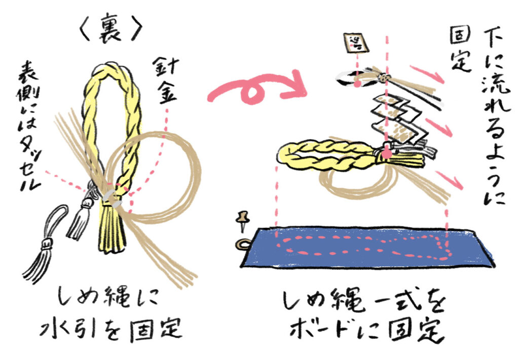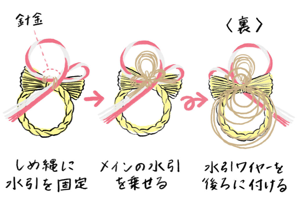 - 白やゴールドの水引をループ状に形作り、しめ縄にグルーガンなどで固定。