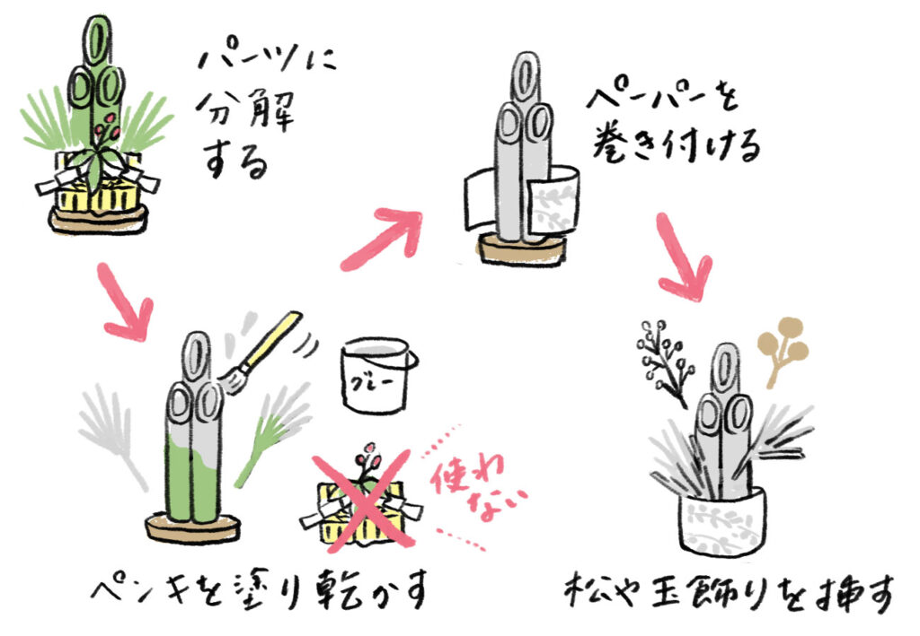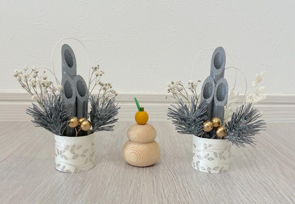 - グレーのペンキを門松や松の造花に塗り、乾燥させる。