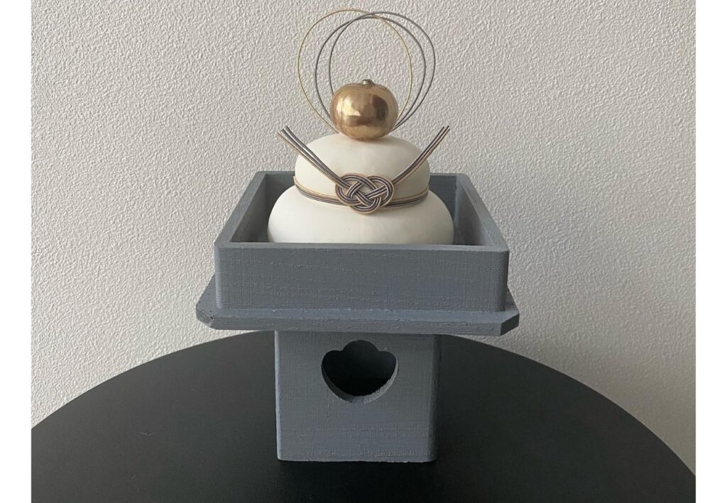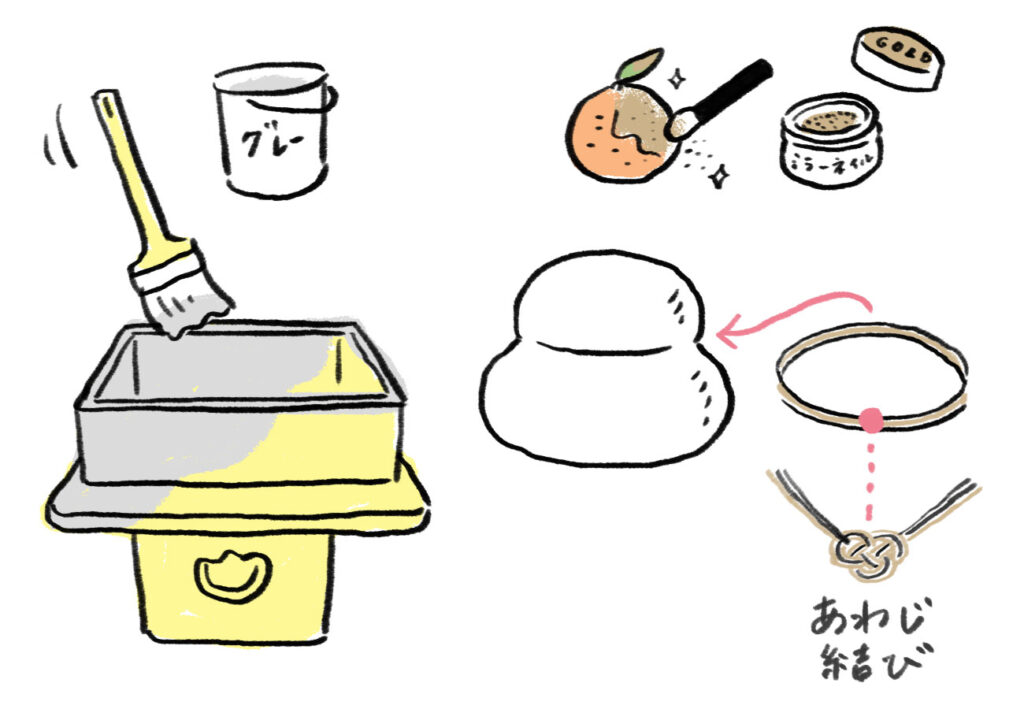 - 水引を「あわじ結び」にして鏡餅に付ける。輪にした水引をグルーガンで接着して固定する。ペイントした土台の上に、鏡餅本体を置き完成。