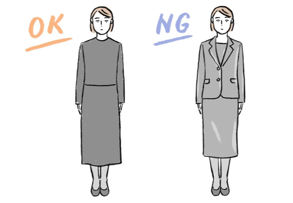 ビジネス用の黒スーツは控えましょう。喪服専用の漆黒に比べると色が薄く、光沢があるため不向きです。