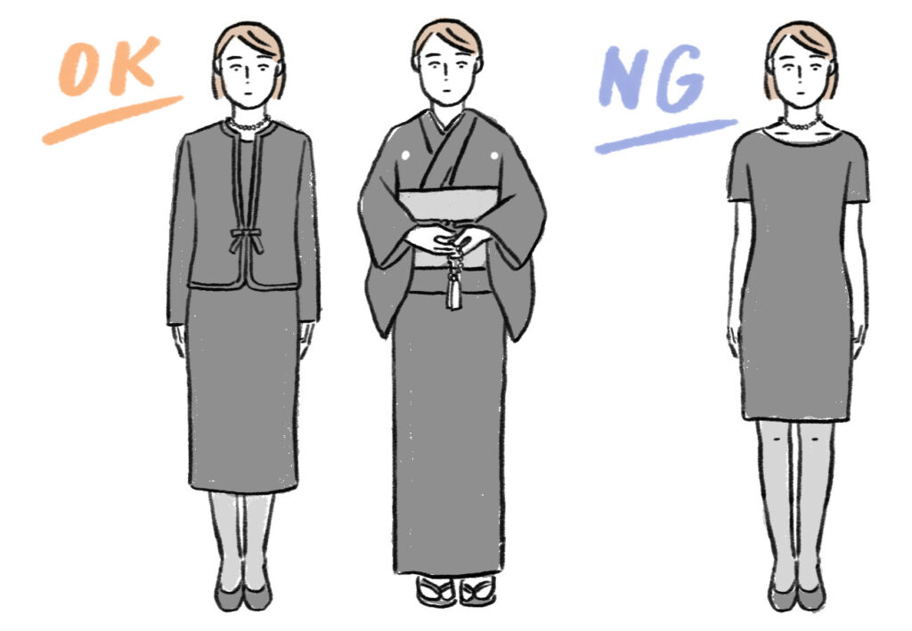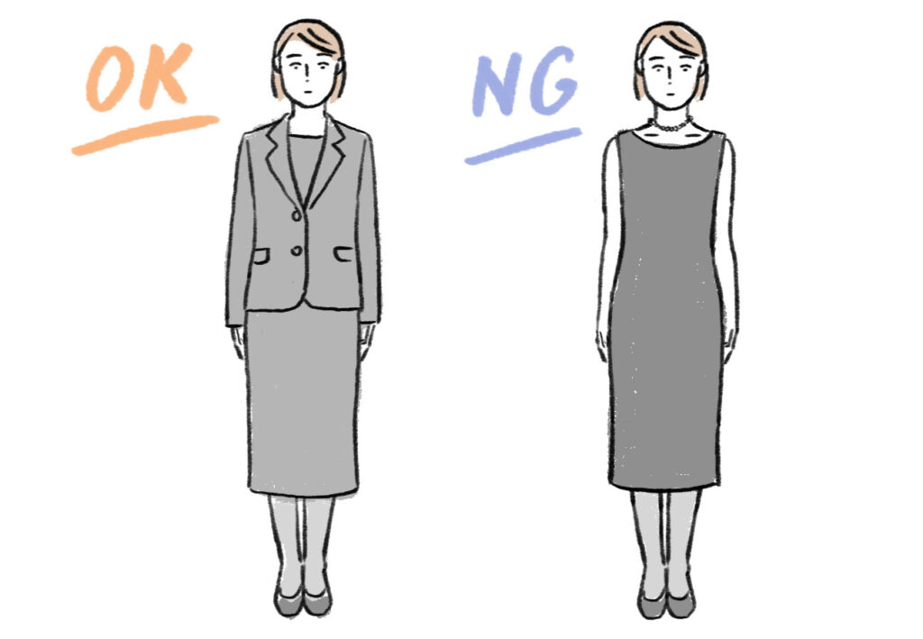 光沢のない漆黒のアンサンブルやワンピースを選びましょう。首元が詰まっていて袖が長く、スカート丈も膝下より長いものなど露出を抑えたデザインがふさわしいです。夏でも長袖や肘が隠れるくらいのものが良いでしょう。