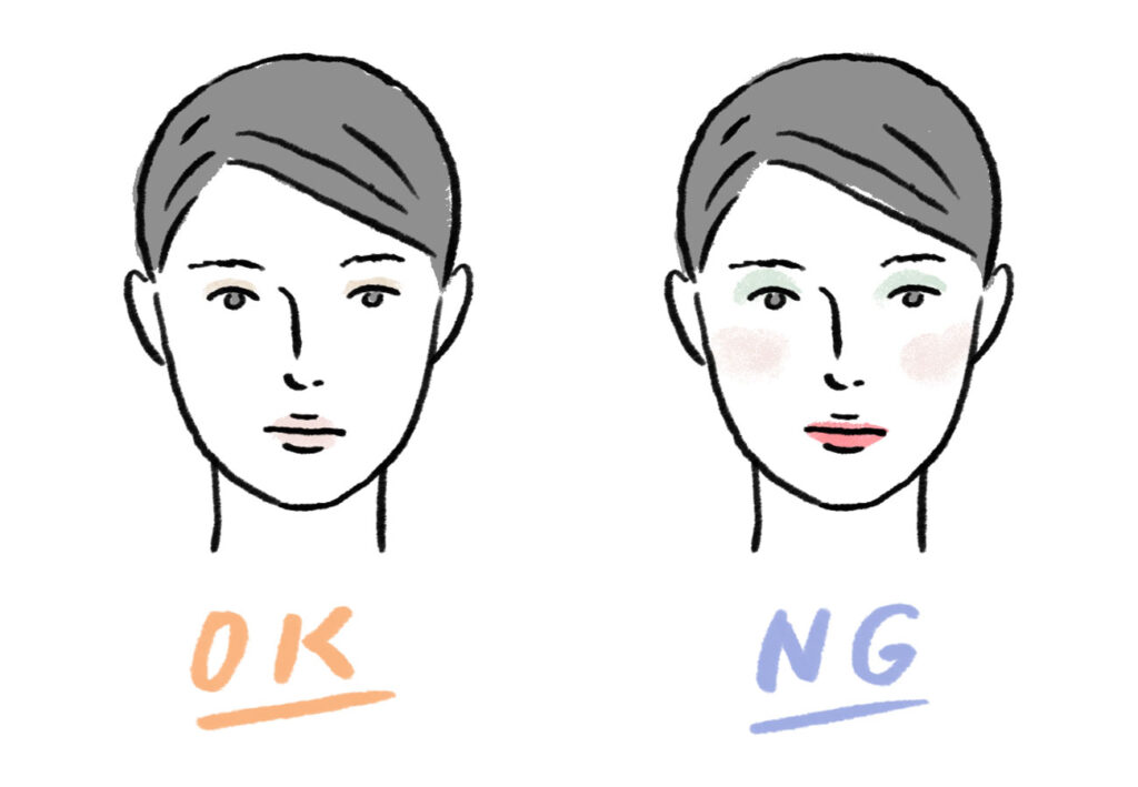 メイクはナチュラルメイクが基本です。肌馴染みの良いベージュ系や落ち着いたピンクベージュを選び、控えめに仕上げましょう。