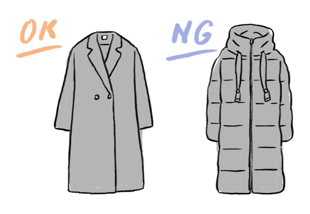 カジュアルなダウンジャケットやモッズコートは極力避けたいですが、天候や遺族の考え方によって受け止め方はさまざまです。大切なのは、マナーを理解した上でその場の状況に合わせご遺族に不快感を与えない選択をすることです。