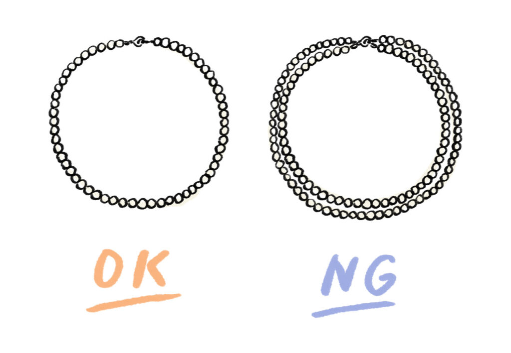 ネックレスの連数に気をつけましょう。「不幸が重なる」ことを連想させる二連や三連のネックレスは避けましょう。