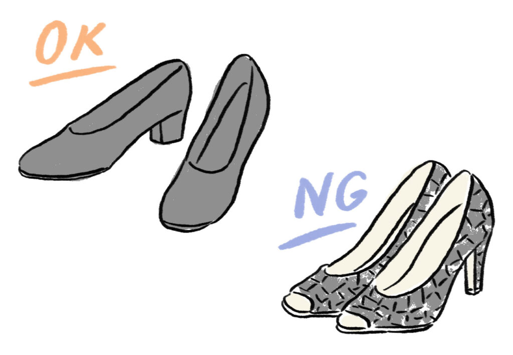 華やかな印象を与えるエナメル素材やスエード、殺生を連想させる型押し(ワニ革・ヘビ革など)はNGです。また、ピンヒールやサンダル、ミュールといった露出の高い靴やカジュアルな靴も避けましょう。