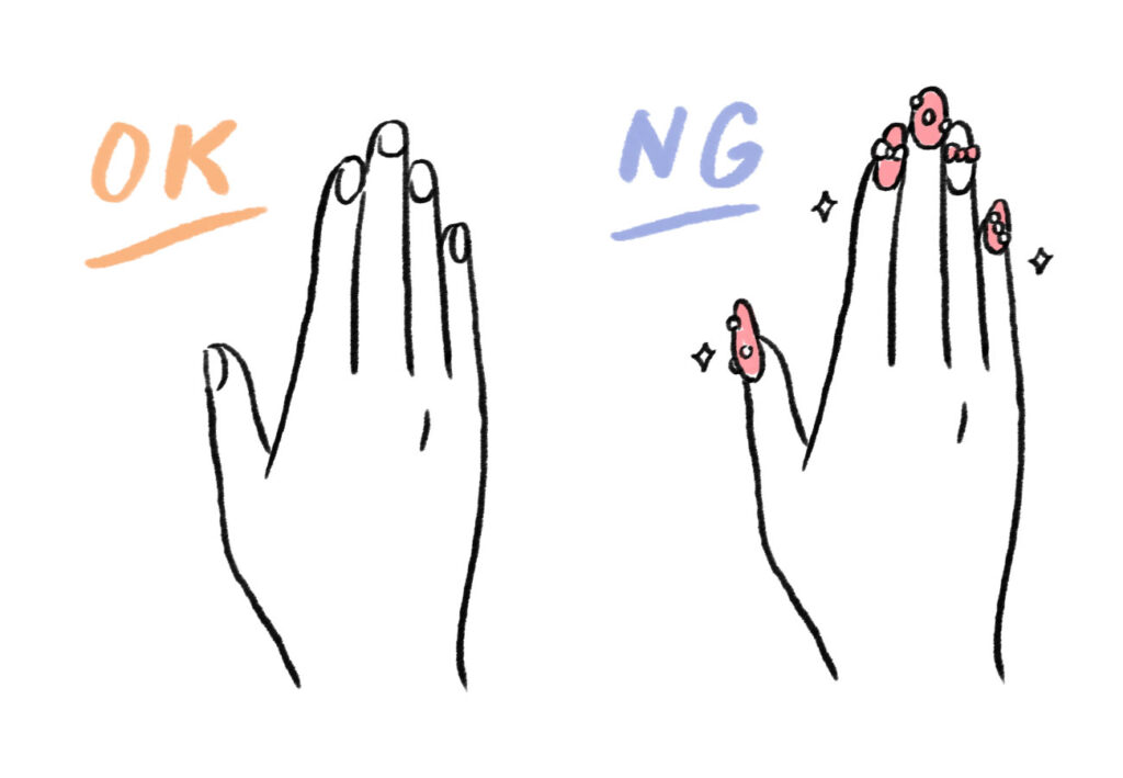 派手なネイルをしている場合そのまま参列するのは避け、OK例のようにナチュラルに見えるようカバーすると良いでしょう。